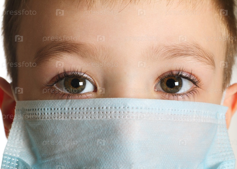Пятилетний мальчик в медицинской маске, изолированный на белом фоне