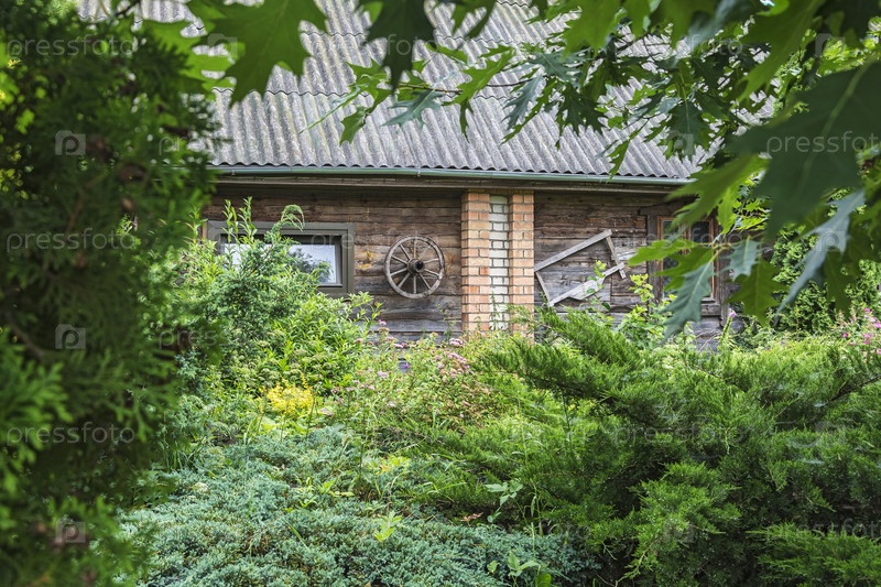 Стена сельского дома с колесом между ветвями зеленых деревьев
