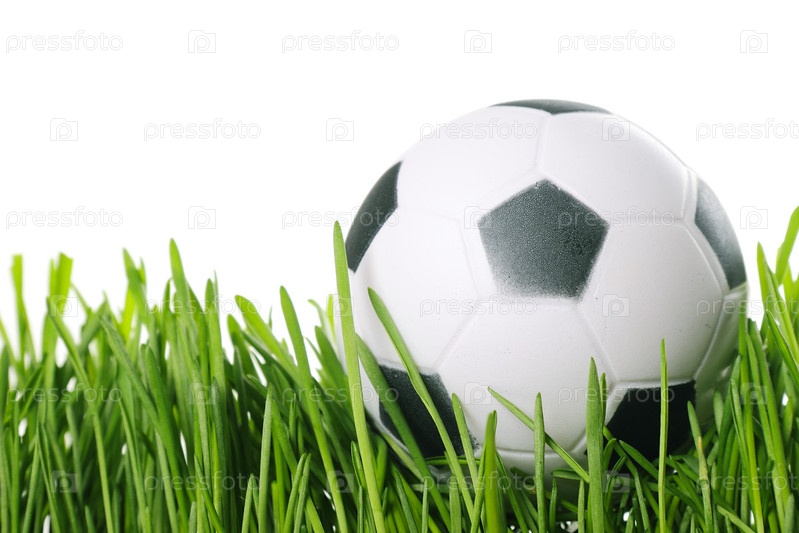 Черно-белый футбольный мяч на траве, изолированный на белом фоне