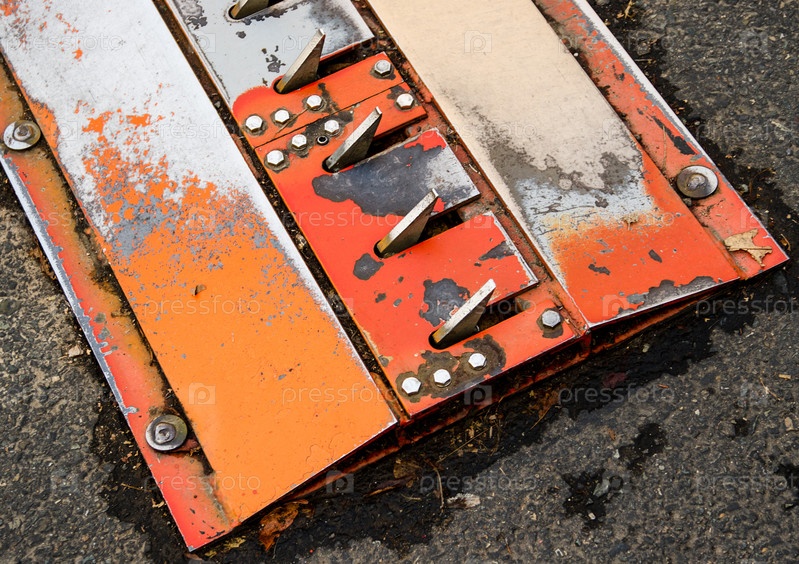 Оранжевая металлическая дорожная полоса с шипами на асфальте