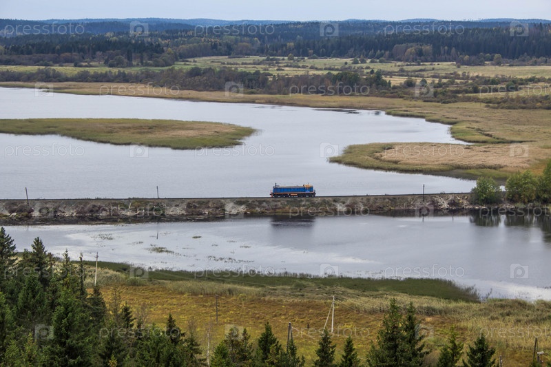 Поезд на железной дороге на озере в Республике Карелия, Сортавала, Россия