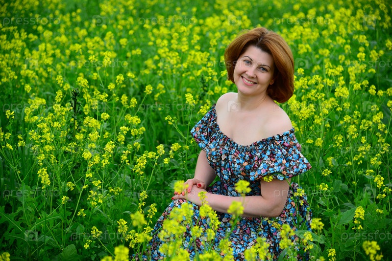 Красивая женщина средних лет на цветущем лугу