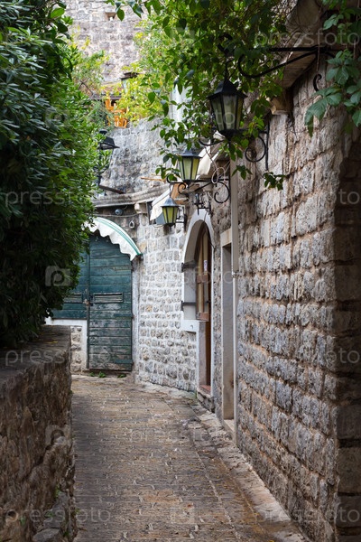 Узкая улица в каменной крепости с фонарями