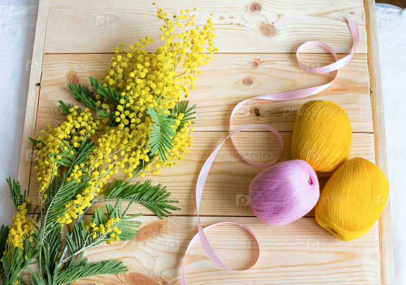 Веточка мимозы с розовой лентой и катушки пряжи на деревянном фоне