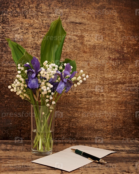 Натюрморт с букетом ландышей и голубых ирисов