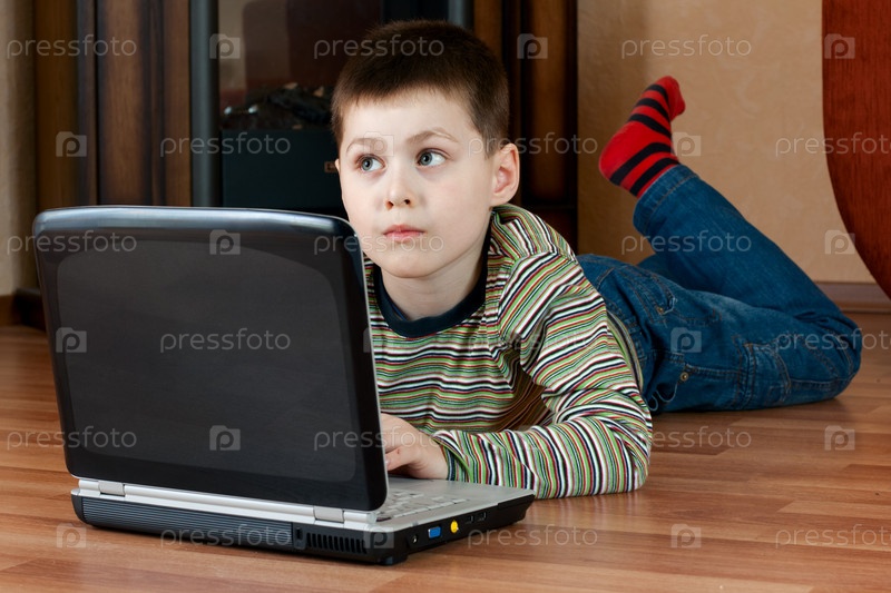 Мальчик лежит на полу в гостиной комнате и играет в компьютерные игры на ноутбуке
