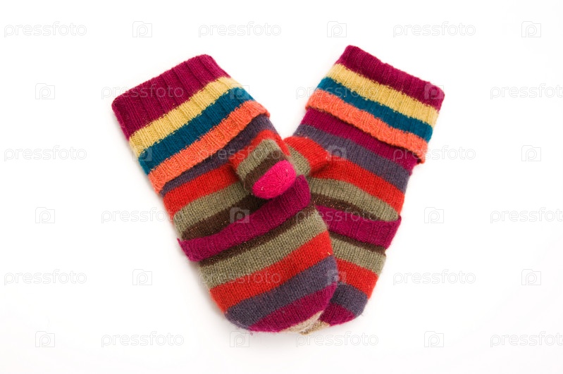 Яркие шерстяные варежки на белом фоне