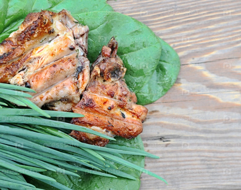 Жареный цыпленок с луком и шпинатом на деревянном столе