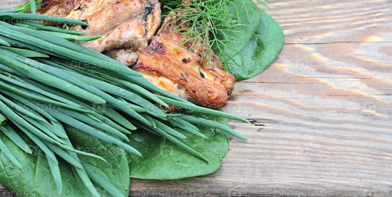 Жареный цыпленок с луком и шпинатом на деревянном столе