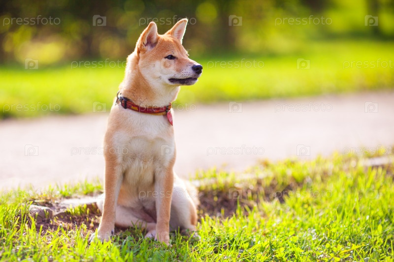 Молодой Шиба ину сидит в парке