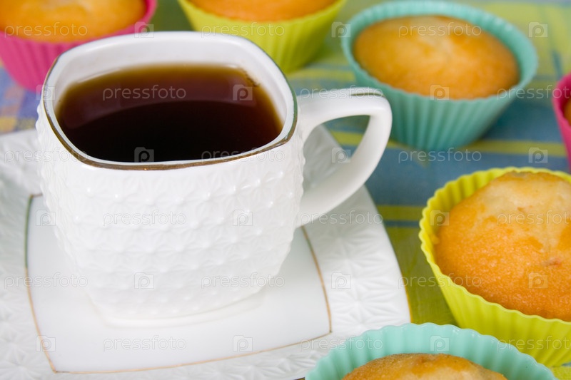 Чашка чая и кексы на сине-желтой скатерти
