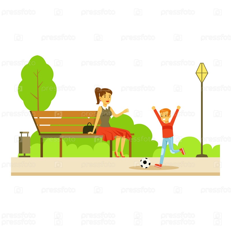 Мама на скамейке и сын играет в футбол