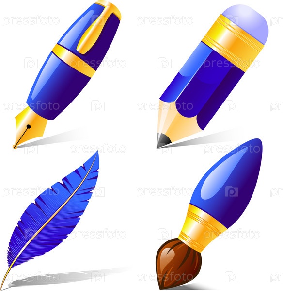 Перьевая ручка, карандаш, гусиное перо и кисть на белом фоне