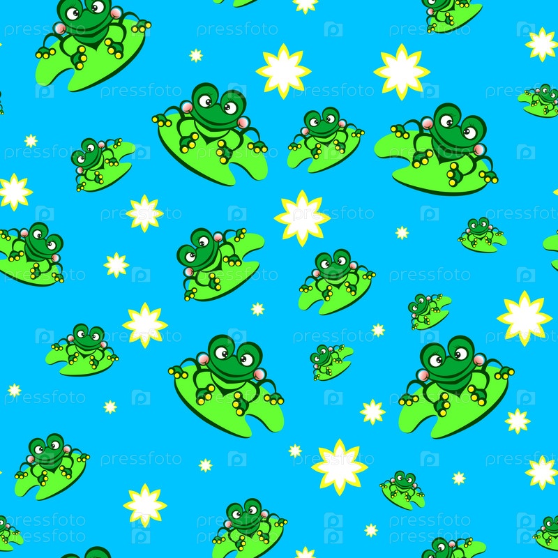 Бесшовный шаблон с мультипликационными лягушками на синем фоне
