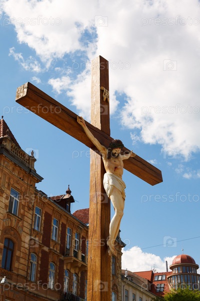 Деревянное распятие на фоне облачного неба