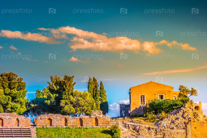 Руины Таормине театра на закате