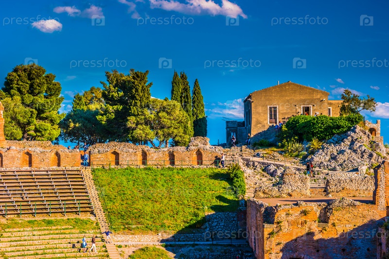 Руины Таормине театра на закате