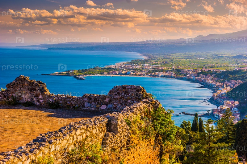 Руины Таормине театра на закате