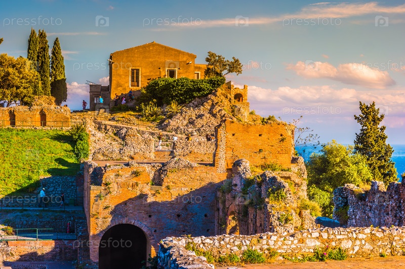 Руины Таормине театра на закате