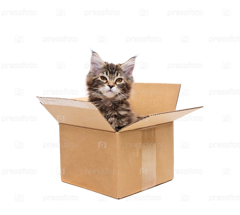Котенок в коробке на белом фоне