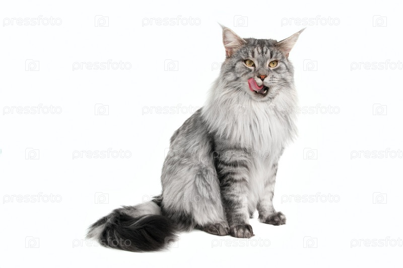 Кошка породы мейн-кун, изолированная на белом фоне