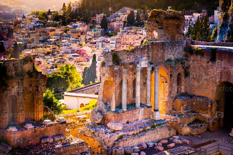 Руины Таормине театра на закате