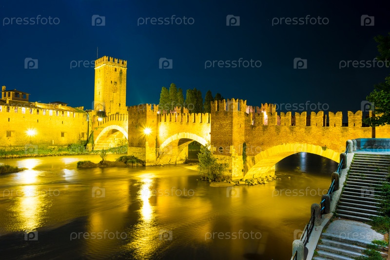 Замок Веккио в летнюю ночь в Вероне, Италия