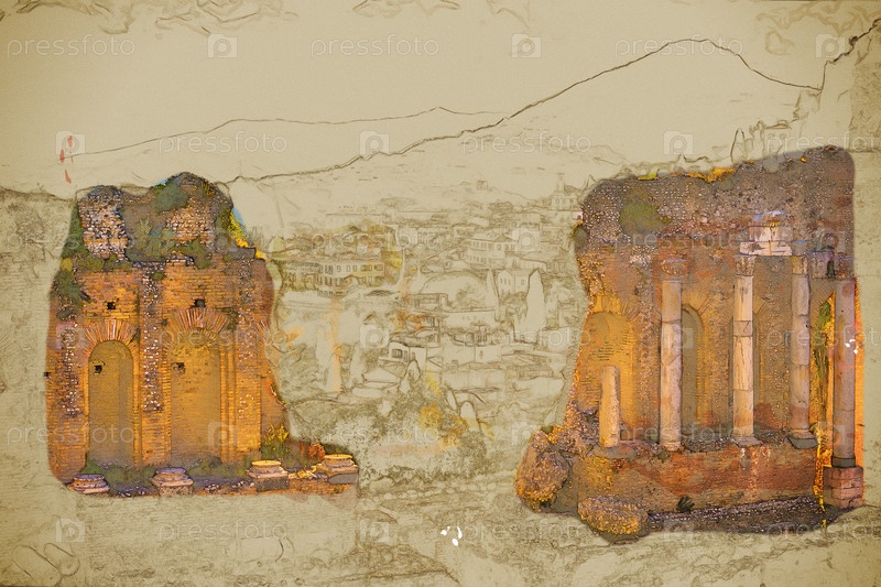 Руины Таормине театра на закате