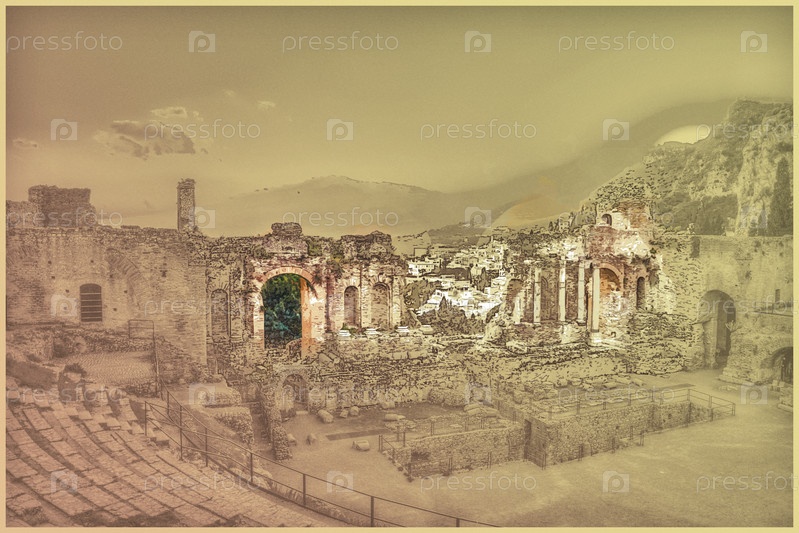Руины Таормине театра на закате