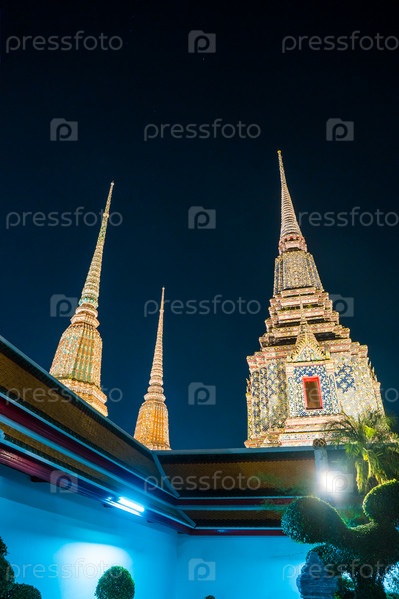 Красиво оформленные пагоды храма Ват Пхо в ночное время