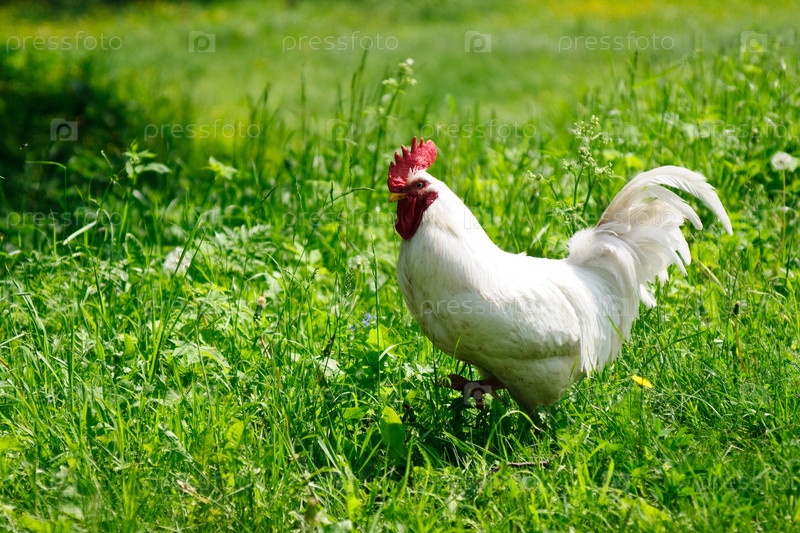 Белый петух пасется на траве