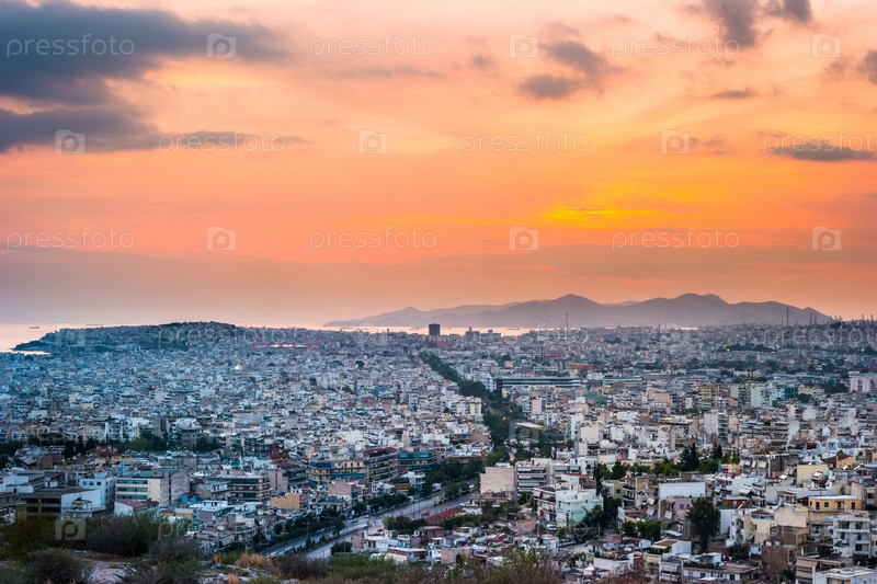 Панорама Афин на закате. Красивый городской пейзаж