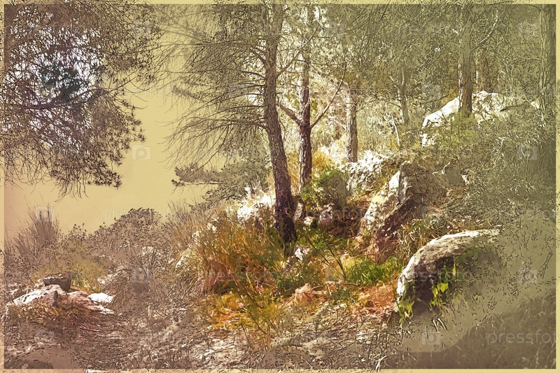 Пейзаж с деревьями и камнями