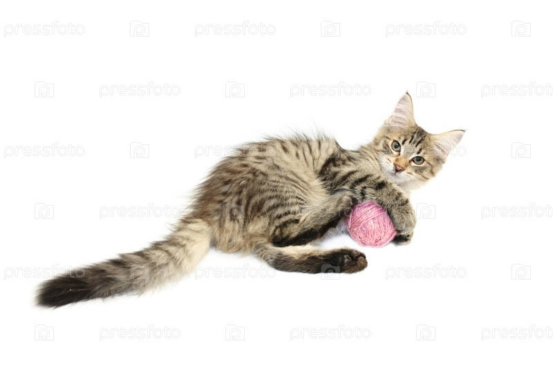 Котенок играет с розовым клубком, изолированный на белом фоне