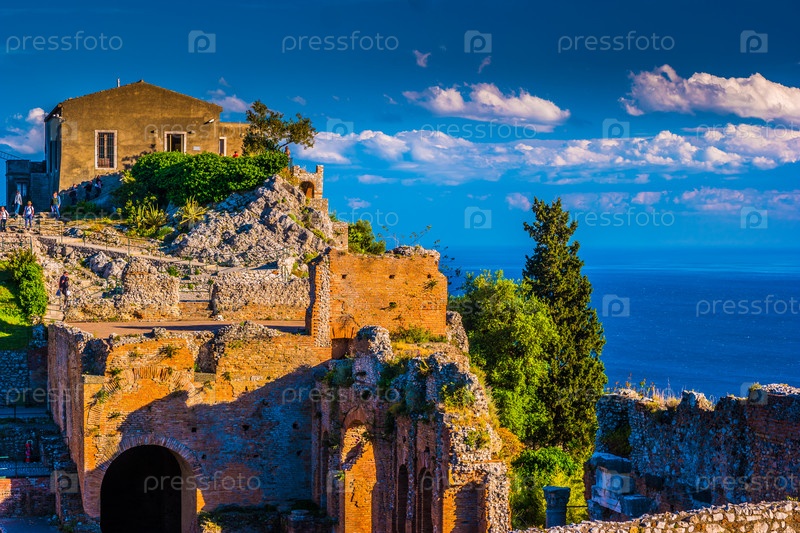 Руины Таормине театра на закате
