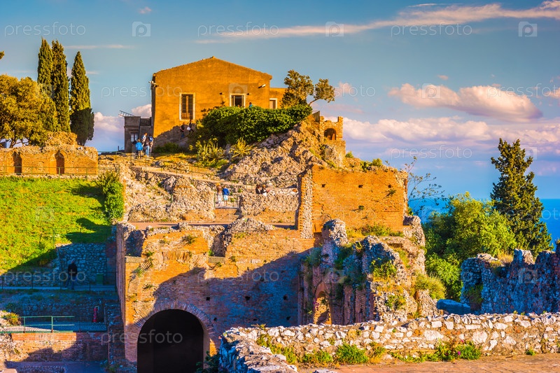 Руины Таормине театра на закате