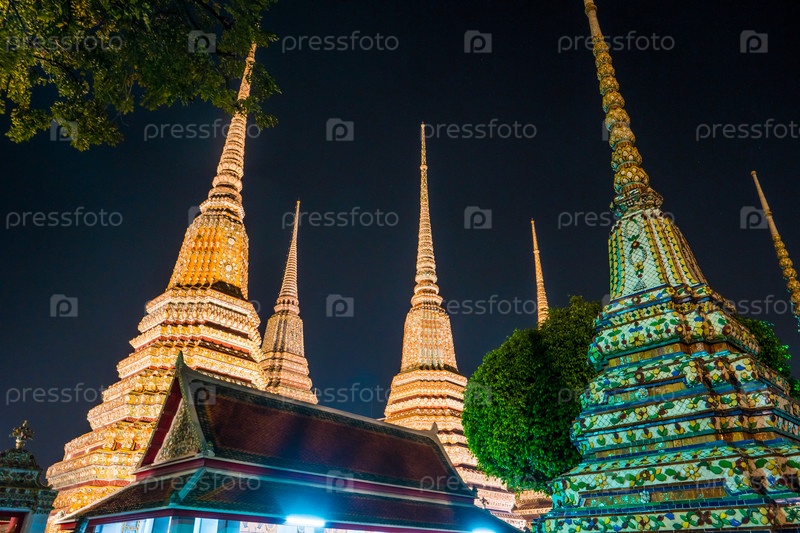 Красиво оформленные пагоды храма Ват Пхо в ночное время