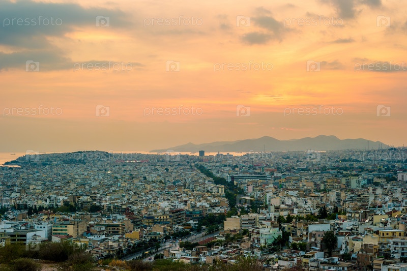 Панорама Афин на закате. Красивый городской пейзаж