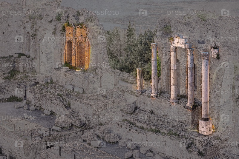 Руины Таормине театра на закате