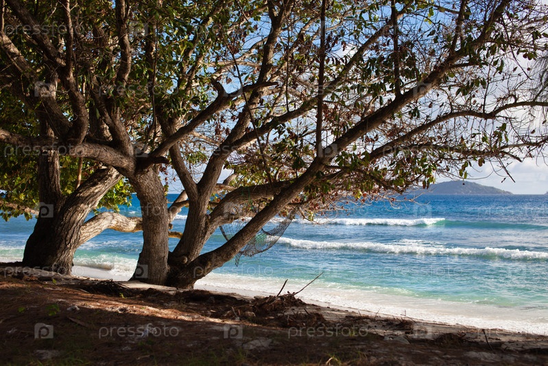 Красивый морской пейзаж с голубым облачным небом и деревями