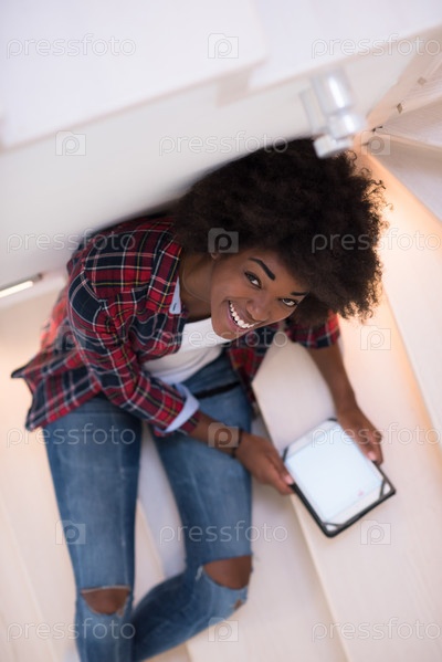 Черная женщина, используя свой электронный планшет