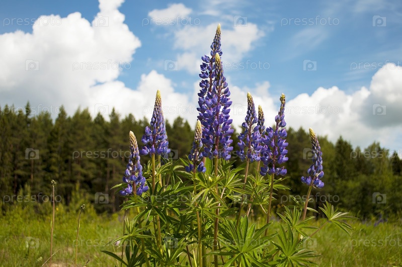 Цветущие полевые люпины на фоне леса
