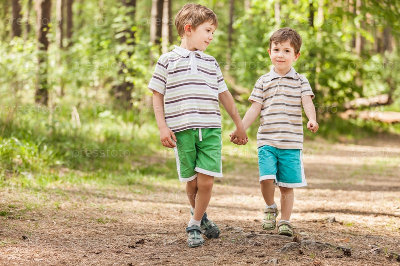 Семейное счастье. Маленькие счастливые братья идут, держась за руки