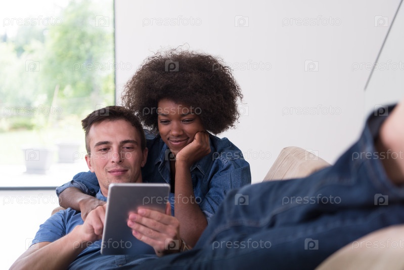 Многонациональная пара отдыхает дома с планшетными компьютерами