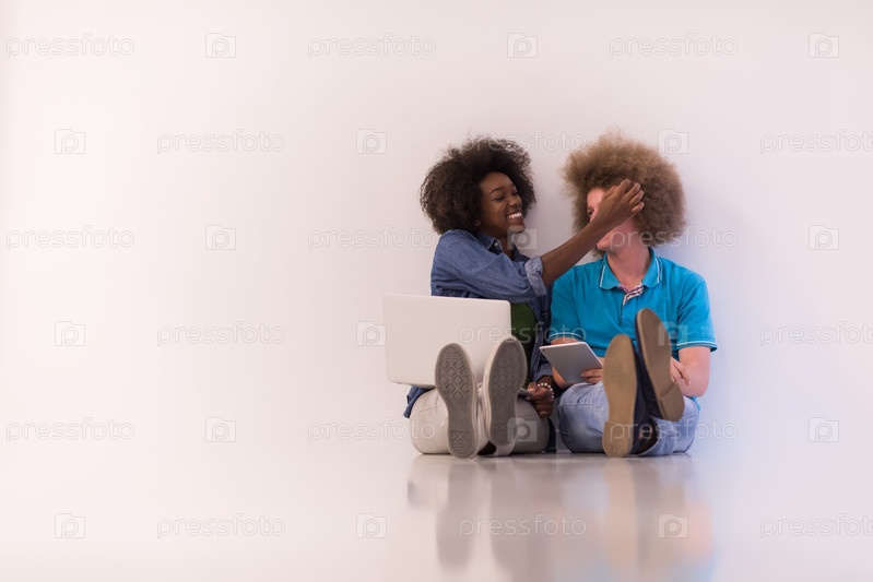 Многонациональная пара с ноутбуком и планшетом