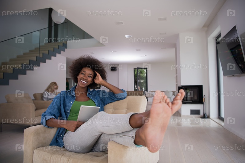 Женщина в доме с цифровым планшетом