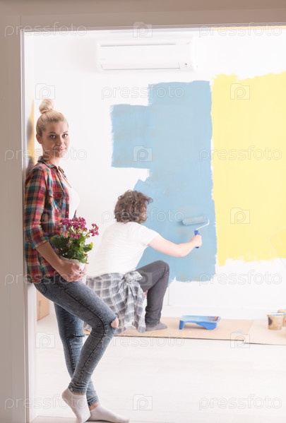 Счастливая молодая пара делает ремонт дома