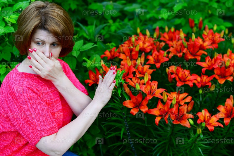 Женщина с аллергическим ринитом около лилий
