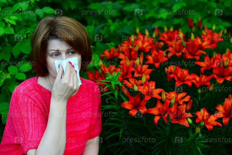 Женщина с аллергическим ринитом около лилий