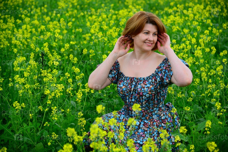 Красивая женщина средних лет на цветущем лугу